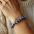 The sodalite bracelet is a piece of jewelry made from sodalite, a deep blue mineral with white calcite veins. The stone is known for its vibrant blue hue and is often used in jewelry, including bracelets, necklaces, and rings. It's considered a powerful stone in spiritual and healing circles.